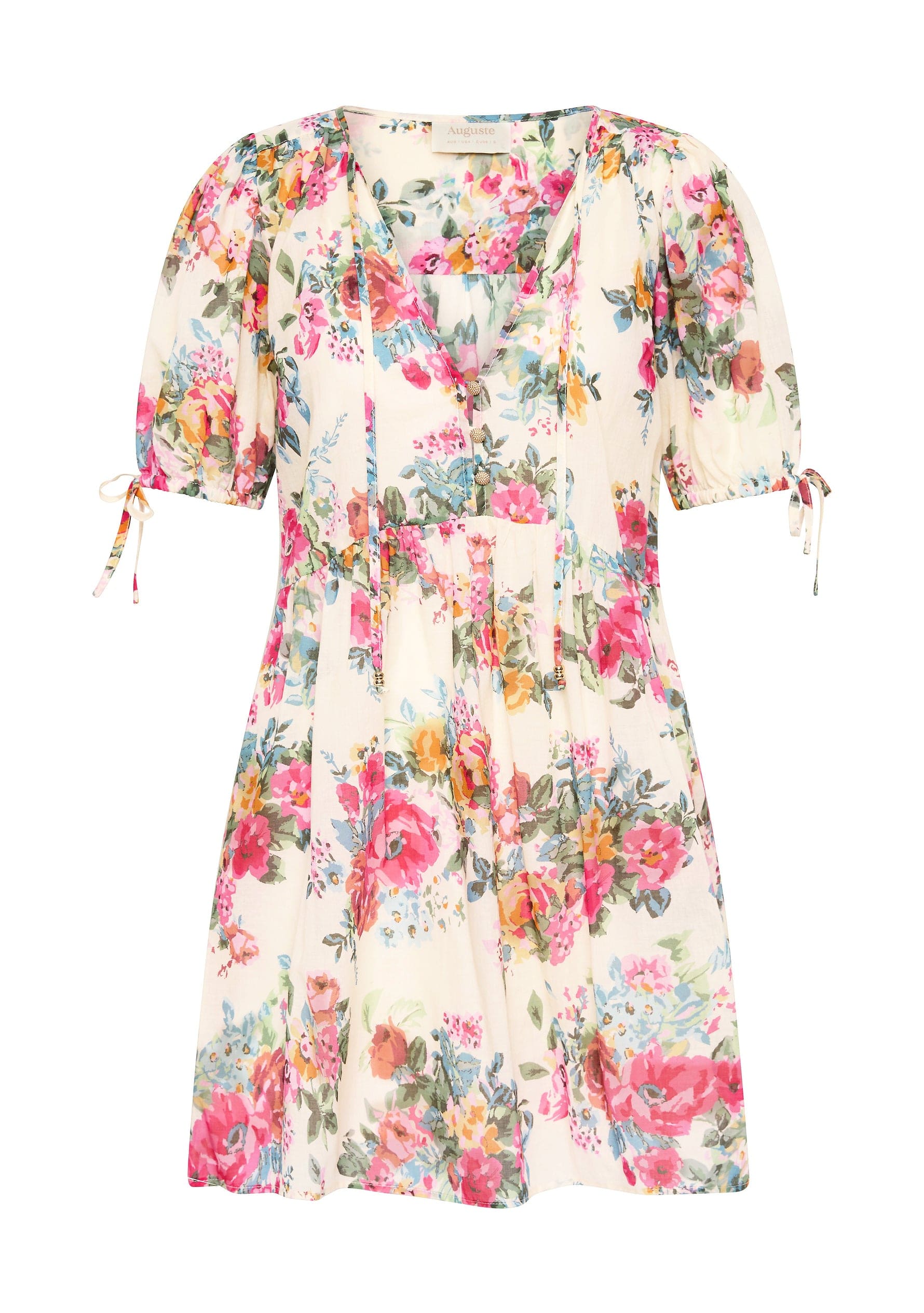 The Evie Mini Dress in our vintage-inspired Iris floral offers effortless charm with a relaxed, comfortable fit. It features a V-neckline with an optional tie closure, soft gathers at the front and back yoke, specialty gold buttons, puff sleeves, and a simple sundress silhouette with a voluminous skirt panel.Our campaign model Alexis is 173cm / 5'8" and wears a Size S.