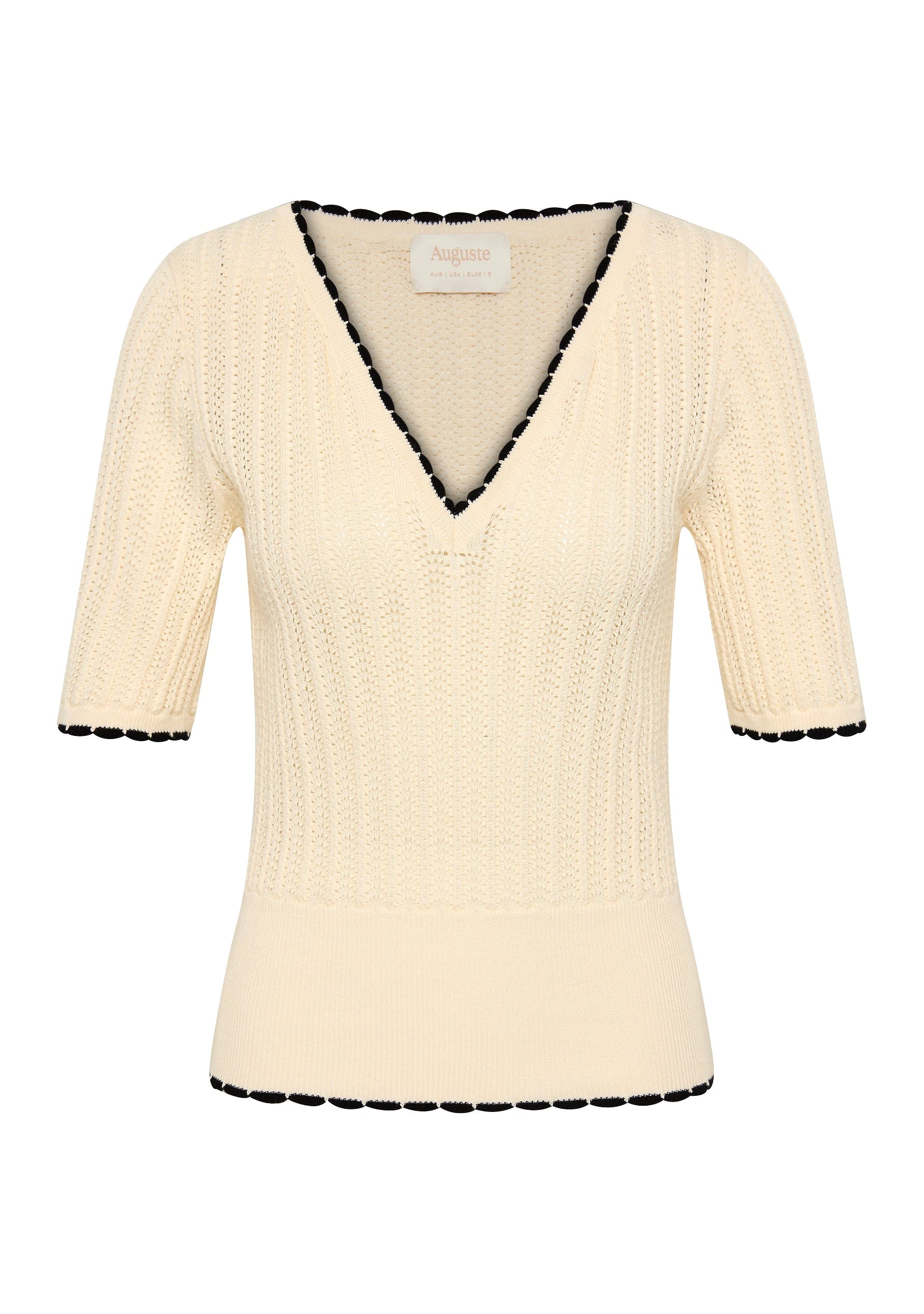 The Jude Knit Tee in off-white cotton with a classic black trim features a V neckline with scallop trim detail. Its fitted design and deep rib hem finish create a sophisticated look, channelling your inner French girl.Our campaign model Alexis is 173cm / 5'8" and wears a Size S.