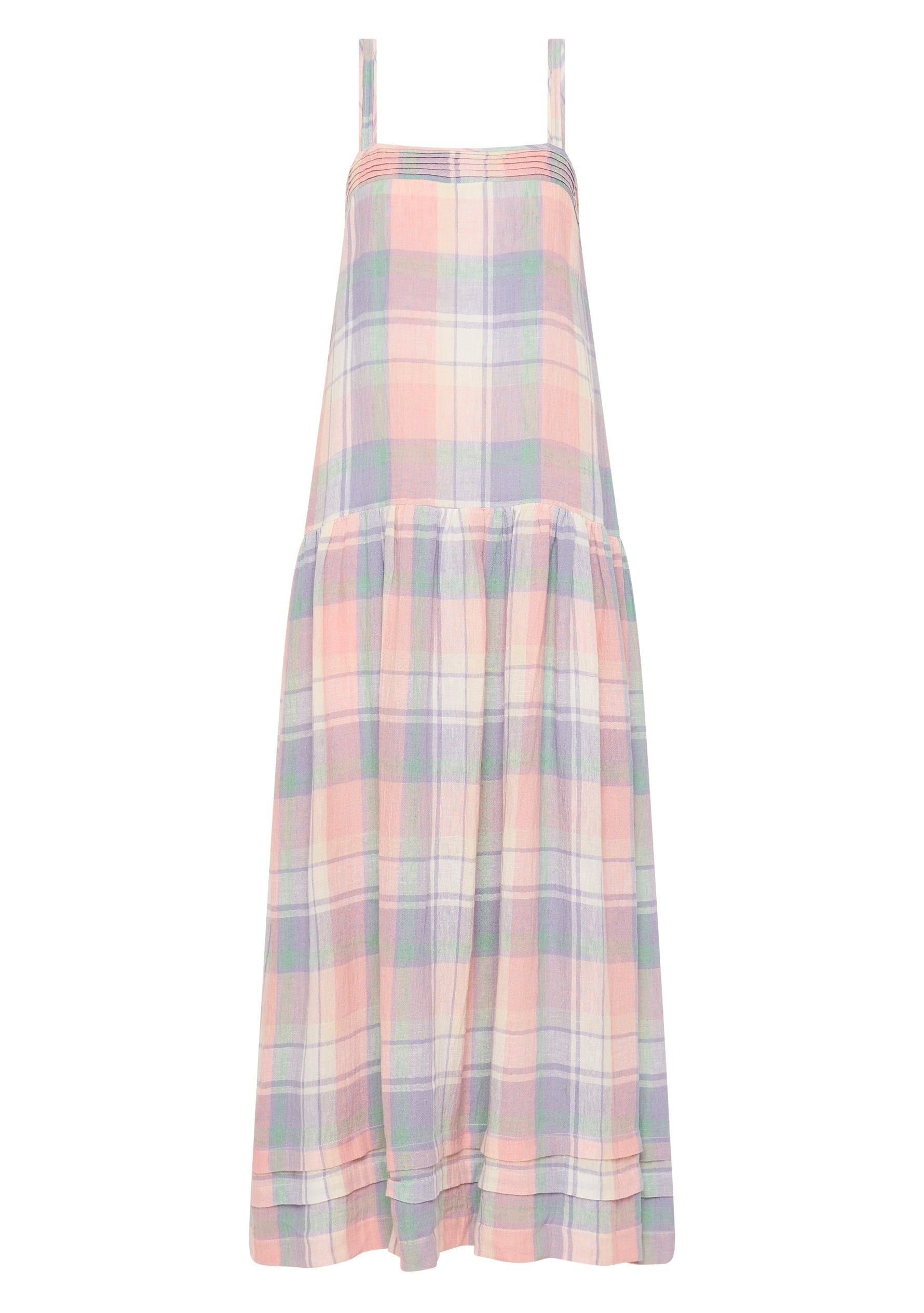 The Olympia Maxi Dress, in a stunning lavender textured plaid, features fixed pintucked straps that lead into a drop waist. Its full-volume tiered skirt, complete with thick hem pintucks, and luxurious linen fabric create a floaty silhouette you'll want to wear again and again. Available exclusively online and in-store at Auguste.Our studio model Mia is 176cm / 5’ 9.5" and wears a Size S.