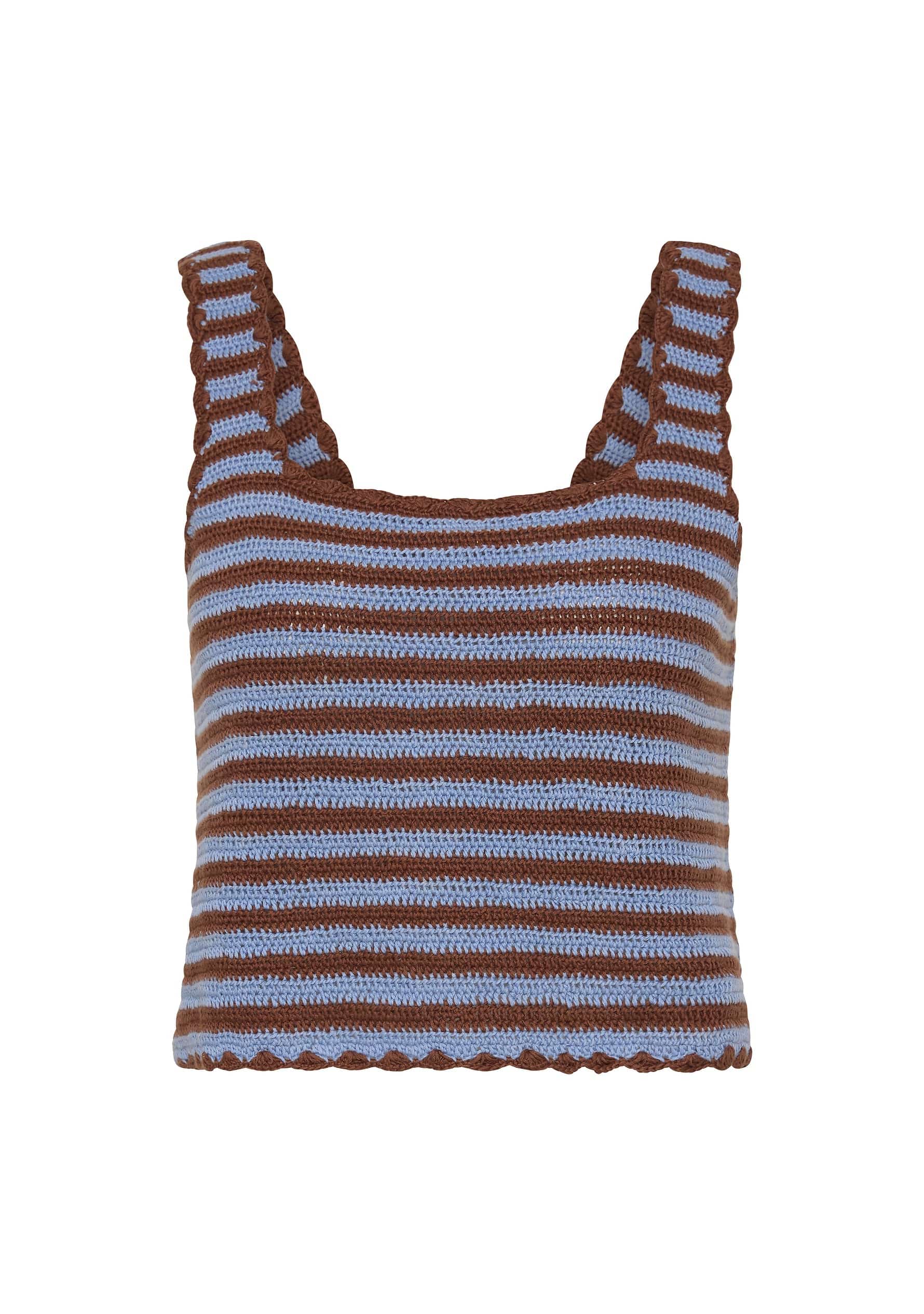 The Tulia Cami Top in chocolate brown and cornflower blue is a chic summer essential. Featuring a square neckline and scalloped details, this hand-crocheted top is made from mid-weight cotton. It pairs perfectly with your vintage denim. Available exclusively online and in-store at Auguste.Our campaign model Montana is 182cm / 5'11.5” and wears a Size S.